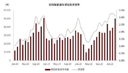 The proposal subsidy strength exceeded market expectations, focusing on its proposed subsidy regression endpoint is the penetration rate of 50%. And January-April 2021, the U.S. EV penetration rate was only 3.1%, significantly lower than Europe 14.9%, China 9.8%. If the policy falls into place, the U.S. market in 2022-2023 is expected to replicate Europe's 2019-2020 market development path, leading to a new round of global growth.