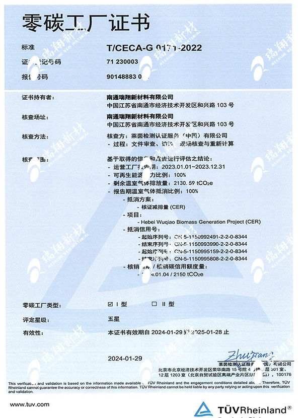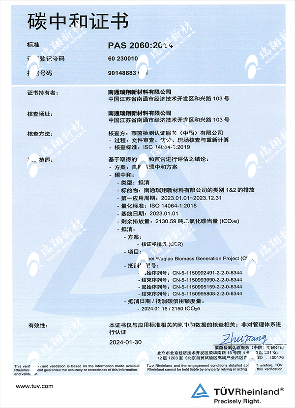 On January 16th, Nantong Reshine New Material Co., Ltd. obtained the certificate of carbon emission and product carbon footprint certification of the organization. The certificate was issued by TüV Rheinland, an international independent third-party testing, inspection and certification organization. This certification lays a data foundation for the enterprise to accurately formulate green and low-carbon strategies and implement carbon reduction programs.